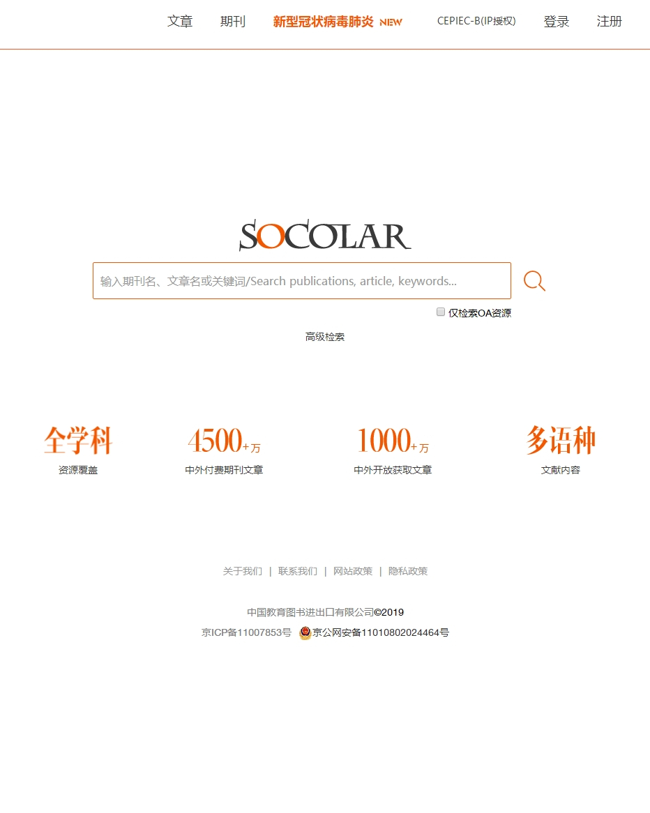 ◇Providing one-stop services including the search, browse and full-text access of articles◇Customized services for librariesWebsite:www.socolar.com Website: xueshu.m.jsny-jn.com/u/ppv